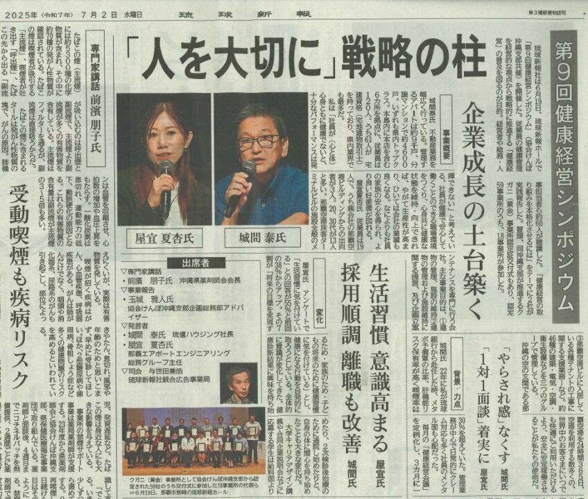 6月19日(木)『第9回健康経営シンポジウム』が行われました。健康経営シンポジウムは、従業員の健康管理を経営的な視点から戦略的に推進する「健康経営」の普及を測るのが目的で、経営者や総務・人事担当者ら約60人が聴講しました。「健康経営の取り組みを本格化させるには」をテーマに弊社も、健康経営を始めたきっかけや課程、現状について登壇させて頂きました。他企業の取り組みなどを拝聴することもでき、とても良い機会になりました。