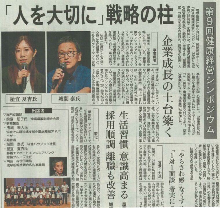 6月19日(木)『第9回健康経営シンポジウム』が行われました。健康経営シンポジウムは、従業員の健康管理を経営的な視点から戦略的に推進する「健康経営」の普及を測るのが目的で、経営者や総務・人事担当者ら約60人が聴講しました。「健康経営の取り組みを本格化させるには」をテーマに弊社も、健康経営を始めたきっかけや課程、現状について登壇させて頂きました。他企業の取り組みなどを拝聴することもでき、とても良い機会になりました。