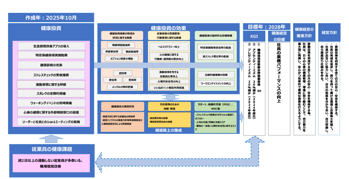 生活習慣FBセミナーの受講(全社員) | 年1回の健康習慣アンケート結果のFBを実践し、 自身の生活習慣の見直しを促し改善へ繋げる | - |