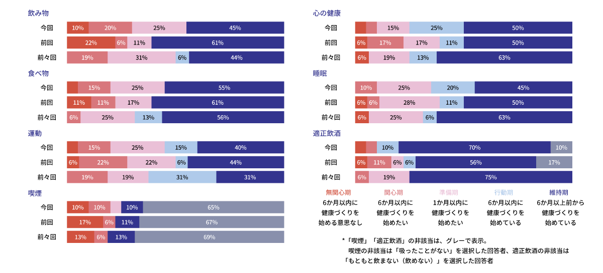 ③ 運動習慣なし(週2日以上、運動しない回答者の割合)(注3) | 70% | 83% | 81% |